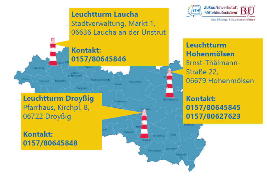 In diesem Projekt bieten wir jungen Erwachsenen bis 25 Jahre, die im ländlichen Raum des Burgenlandkreises beheimatet sind, Unterstützung und Begleitung bei der Suche nach einem Praktikums-, Ausbildungs- und Arbeitsplatz. Sie bekommen Hilfe in unseren Anlaufstellen in Hohenmölsen, Droyßig und Laucha, aber wir sind auch mit einem mobilen Angebot vor Ort.